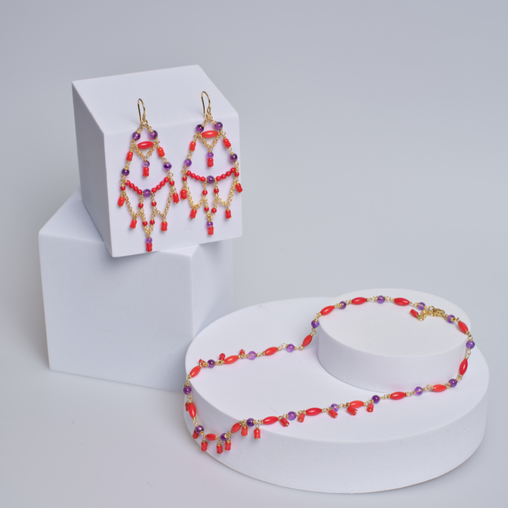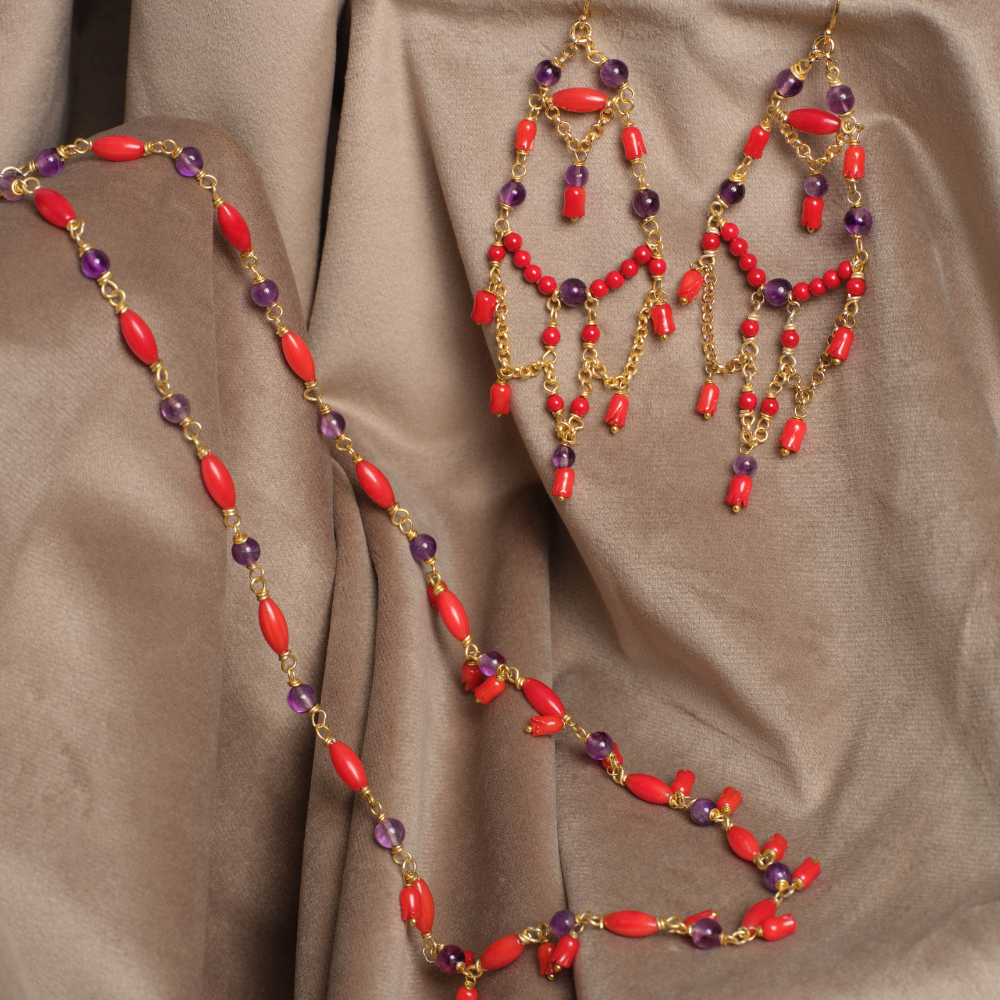 Gli orecchini sono realizzati con corallo bambú rosso e quarzo ametista. Montati in ottone dorato nichel free. Il girocollo con corallo di bambù rosso e quarzo ametista è montato su una raffinata catena in ottone dorato nichel-free. La chiusura in argento rodiato oro aggiunge un tocco di eleganza. Con una lunghezza regolabile massima di 50 cm